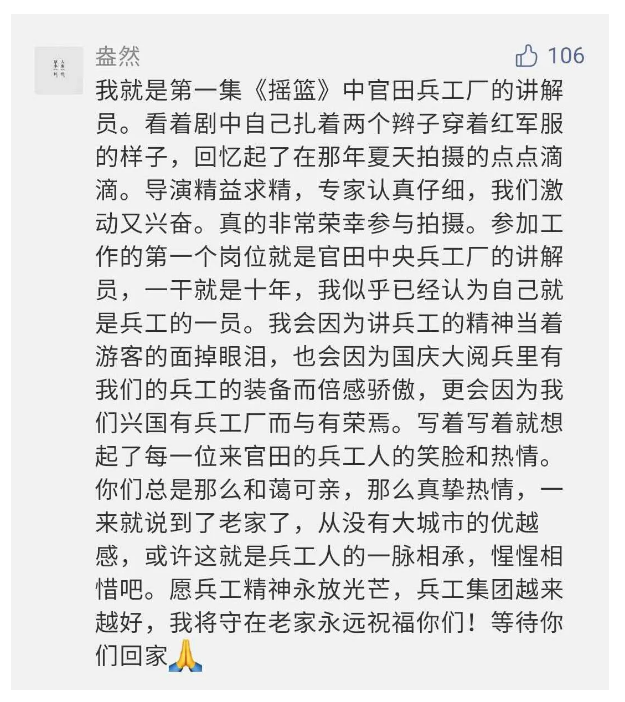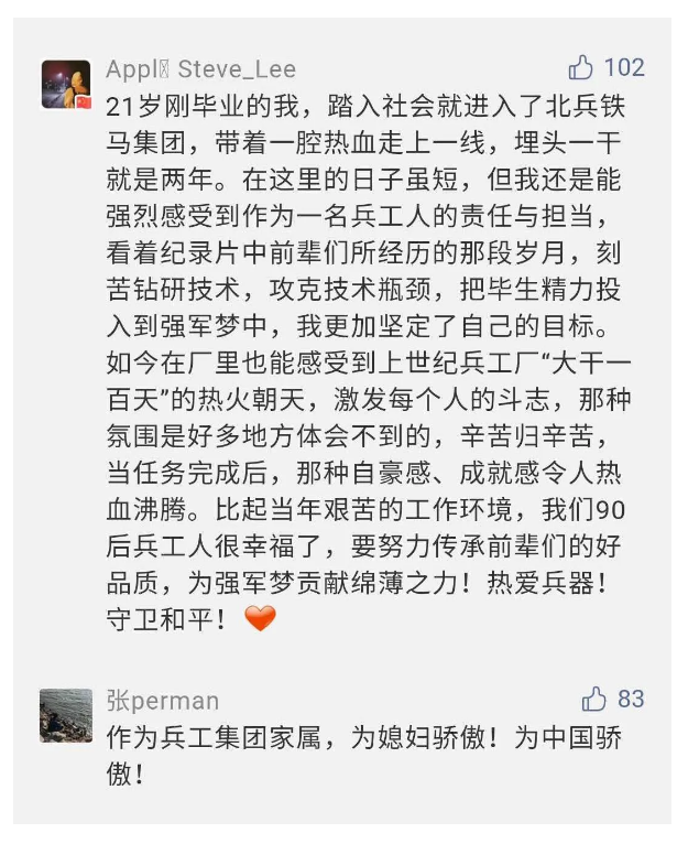 在中國共產(chǎn)黨成立九十九周年之際,由中國兵器工業(yè)集團有限公司組織攝制、反映人民兵工在黨的領(lǐng)導(dǎo)下80余年光輝奮斗歷程、廣大兵工人弘揚“把一切獻給黨”人民兵工精神的三集紀錄片《人民兵工》自7月1日-3日每晚20點在中央廣播電視總臺中文國際頻道(CCTV-4)《國家記憶》首播以來,在兵器系統(tǒng)和觀眾中引發(fā)強烈反響,很多網(wǎng)友、觀眾紛紛留言表達了自己的觀后感受。 觀眾在兵器工業(yè)集團官微的留言區(qū)直抒了觀影感受,有的熱淚盈眶,有的心潮起伏,有的興起賦詩,有的認為讓心靈得到凈化、思想得以提升,有的認為是最直觀的國防教育教材...... 影片勾起了退休老同志無限懷念、兵工人的甜美記憶、攝制期間官田中央兵工廠文化教育基地工作人員的難忘瞬間...... 相比老一輩,年a輕的兵工人也表達了傳承紅色基因,弘揚新時代“把一切獻給黨”的人民兵工精神的豪邁氣概...... 其中也不乏在校的學(xué)生,在感謝英模樹立的榜樣和豐碑的同時,也為自己的職業(yè)生涯定好坐標、做好規(guī)劃,努力前行...... 作為新時代弘揚人民兵工精神的特色文化成果,紀錄片的播出,凝聚起廣大兵器干部職工團結(jié)奮斗新時代磅礴力量,極大的增強了兵工人的自豪感,大家紛紛表達了作為軍工央企一員 “此生無悔入軍工”的使命擔當...... 《人民兵工》共分為三集,分別是《搖籃》《錘煉》《前行》,全景式展示了我們黨領(lǐng)導(dǎo)和創(chuàng)建的第一個軍事工業(yè)部門——人民兵工80余年來從無到有、從小到大、從弱到強的光輝奮斗歷程,生動講述了廣大兵工人聽黨話、跟黨走,大力弘揚“把一切獻給黨”的人民兵工精神,自力更生、艱苦奮斗、開拓進取、無私奉獻的家國情懷和感人事跡。在人民兵工80余年篳路藍縷的奮斗歷程中,涌現(xiàn)出吳運鐸、倪志福、祝榆生等一大批英模人物,在血與火的考驗中凝練形成了“把一切獻給黨”的人民兵工精神,成為人民兵工奮斗不息的紅色基因。(王珊) |
