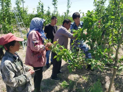 王躍(右一)指導村集體經(jīng)濟果園工人稀果