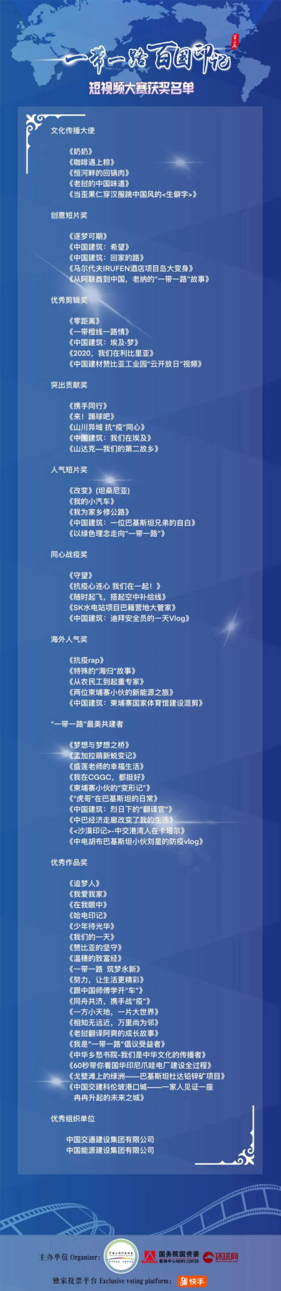本屆大賽獲得了眾多參與“一帶一路“發展建設的大型企事業單位及個人的響應,共征集了來自近80個國家的500余部參賽作品。經過公眾投票與專家評審的兩輪角逐,本屆大賽最終評選出文化傳播大使獎、創意短片獎、優秀剪輯獎、突出貢獻獎、人氣短片獎、同心戰疫獎、海外人氣獎各5名,“一帶一路”最美共建者 10名,優秀組織單位 2個,優秀作品獎20名。