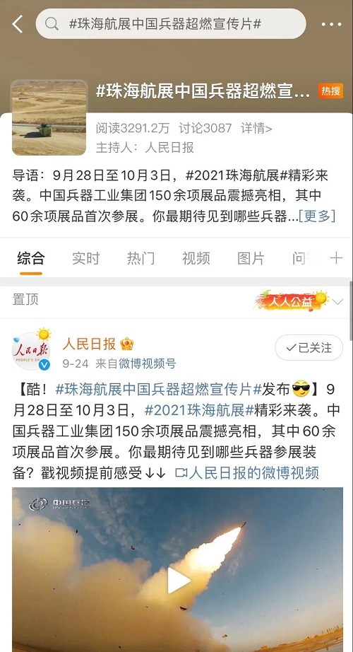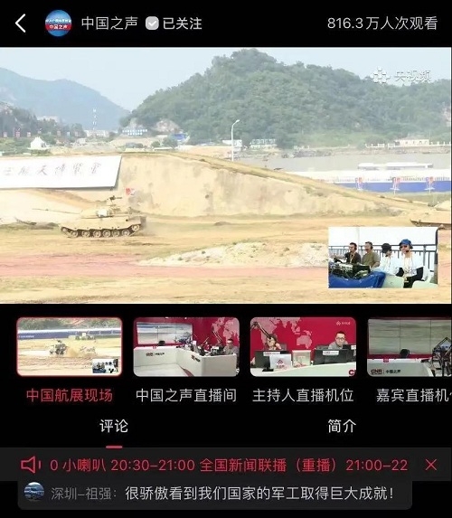 人民日報、新華社、中國日報、共青團中央、國資小新、騰訊軍事、鳳凰軍事、新浪軍事等新媒體發(fā)布的集團公司航展宣傳片等視頻作品燃爆全網(wǎng),閱讀量突破三千萬人次,得到外交部發(fā)言人趙立堅轉(zhuǎn)載點贊。集團公司微信、微博、抖音號、微信視頻號等新媒體宣傳片播放閱讀量超過400萬人次。同時,央視新聞、新華社、中國之聲、央視軍事、央視新媒體、解放軍報、共青團中央、國資小新、環(huán)球時報等多家媒體對集團公司靜、動態(tài)展區(qū)進行現(xiàn)場直播,在電視端、客戶端、微信視頻號、微博、B站、快手、抖音等平臺受到高度關注。著名軍事專家杜文龍、央視主持人顧國寧、央廣中國之聲主持人王藝等直播兵器館、動態(tài)表演區(qū)裝備。