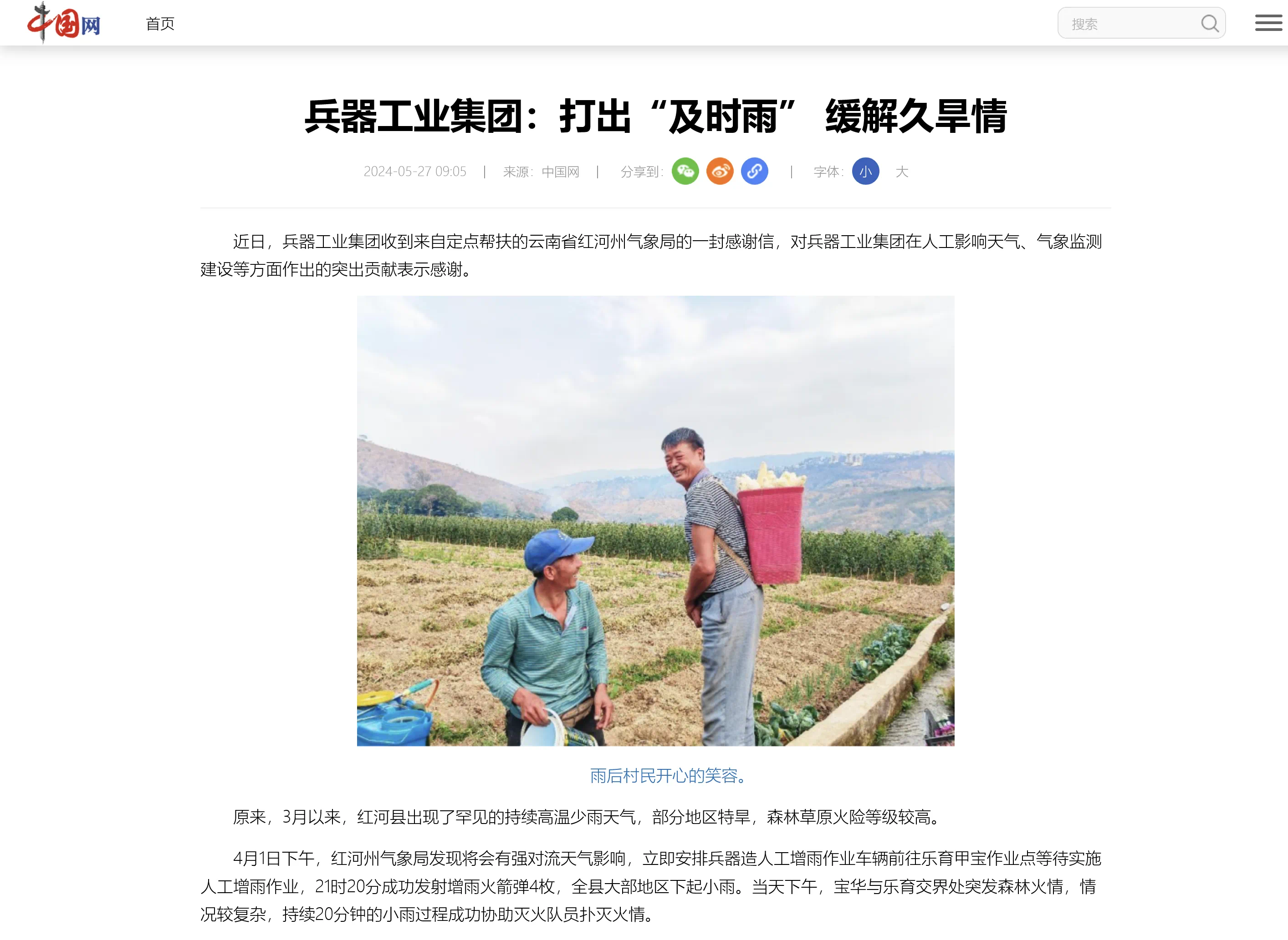 5月27日,中國網刊發《兵器工業集團:打出“及時雨” 緩解久旱情》,對中國兵器工業集團有限公司助力云南省紅河州人工影響天氣、氣象監測建設等方面作出的突出貢獻作了報道。