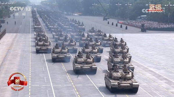 作為陸軍地面突擊力量的新一代裝甲裝備,受閱的99B坦克、100坦克、100支援戰車,呈箭型走在地面裝備方隊的最前列、頭陣領銜駛過,盡顯機動奪要、攻堅突破的強大戰力,是我軍高技術裝備體系的重要組成部分。